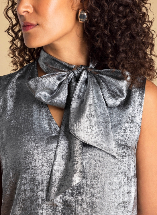 De Amylia top van Ivy Beau straalt glamour uit. De hoge halslijn loopt over in een sierlijke strik en de glanzende stof geeft een chique effect. Verkrijgbaar in silver en dark red – voor wie durft te schitteren.